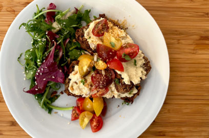 A savory breakfast or quick lunch made with seed bread, cashew ricotta and baby tomatoes