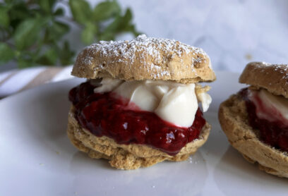 For these gluten free vegan scones I utilised my favourite new kitchen tool – the air fryer! And they came out delightfully crumb-tastic and melt-in-your-mouth buttery goodness (without the real butter, of course). To make these air fryer scones even a bit more health-centric, I used a delicious vanilla oat yogurt instead of the typical heavy cream. I use Oatly brand – the vanilla yogurt goes great with these! But feel free to use any yogurt you fancy (or coconut cream for that matter!) The Silk brand Greek Coconut Yogurt would be another fabulous option. If you’re looking for a quick homemade jam that pairs well with this treat check out my Strawberry Chia Jam. While these gluten free vegan scones may not quite be the same as sitting in a high tea in London, they certainly made me feel nostalgic of my time in the UK. 🙂
