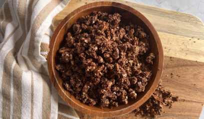 Peanut butter chocolate granola is a delicious and nutritious snack that can be enjoyed at any time of the day. This recipe has zero refined sugar and is lightly sweetened with maple syrup. I’ve made this recipe entirely gluten free and vegan as well, using GF quick oats and coconut oil. I also enjoy using powdered peanut butter in granola. The runny consistency of the peanut butter allows for a nice coverage and really helps create those delish little chunky morsels of oats we love in granola. I enjoy using the powdered PB on other goods as well, like my Chia Seed Puds! Making this in the air fryer was super quick and easy! But if you’d prefer it can also be baked on a single layer in the oven at 300deg for 30 minutes, flipping once.