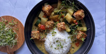 This vegan Thai Peanut Curry is a flavorful and easy to prep dinner that is also gluten-free friendly. This recipe comes along with a crispy tofu option – or prepare the tofu as you’d like! Also feel free to omit and add in additional favourite veggies. I love red pepper, broccoli, zucchini and just a bit of potato with this recipe. Peas, green beans, eggplant and chickpeas would also make for great additions. This vegan Thai Peanut Curry is all about flexibility – allowing you to choose your own adventure or use up leftover or frozen vegetables. If you’re looking for additional tofu ideas see my new Sesame Crusted Tofu recipe served with fried rice! I love Wildwood Food’s tofu 2 pack – as it is just the right amount of tofu for smaller serving sizes or cooking for 1-2 people.